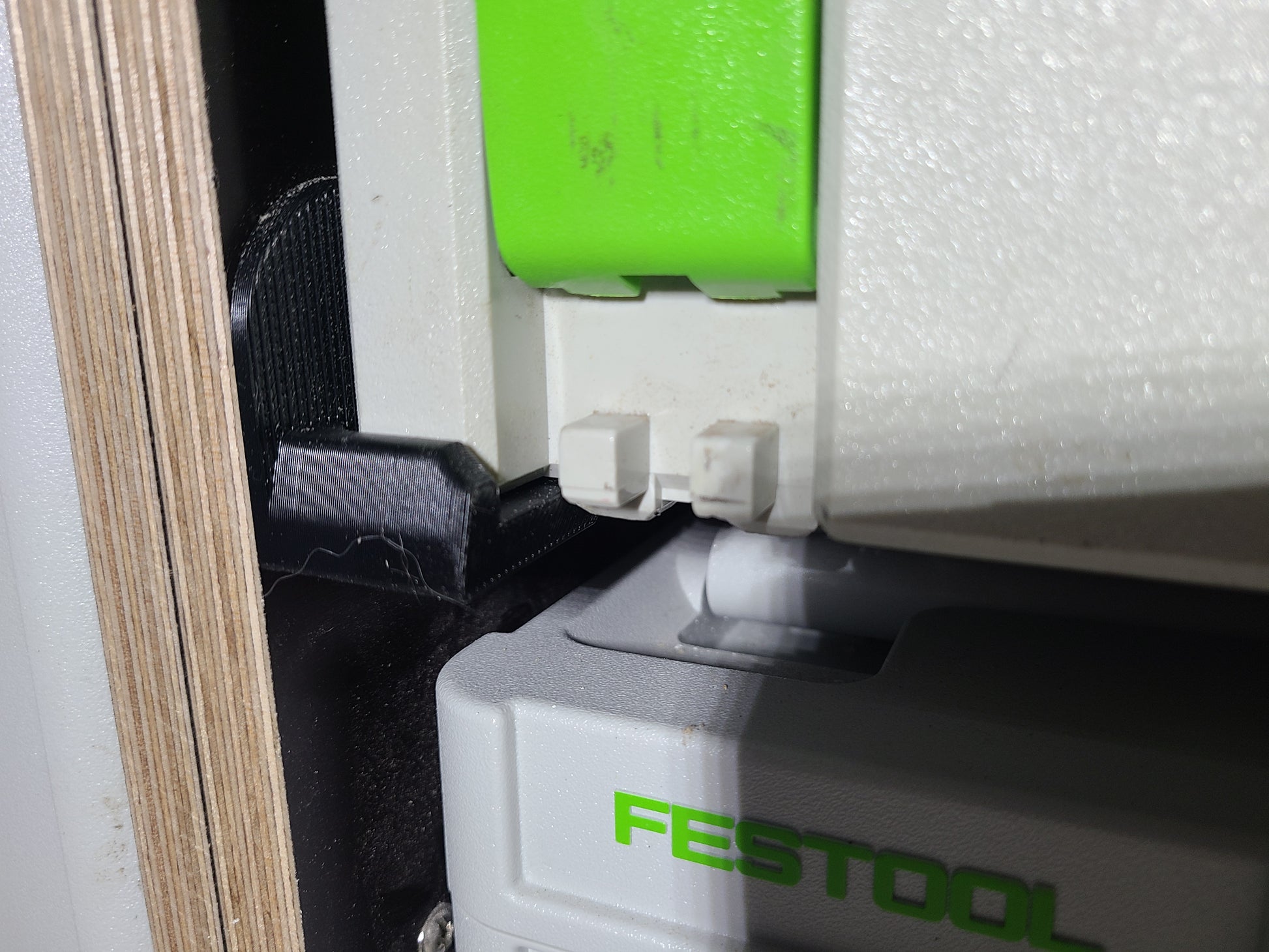 Deze bekende merken en alle afgeleide passen allemaal op deze rail. De systainer wordt erop geschoven, waardoor deze geen kant op kan tijdens transport en in de werkplaats. Aan de voor en achterzijde is een nok gemaakt, die de systainer op zijn plek houdt. De achterzijde/eindnok van de rail moet tegen een achterwand aan geplaatst worden,